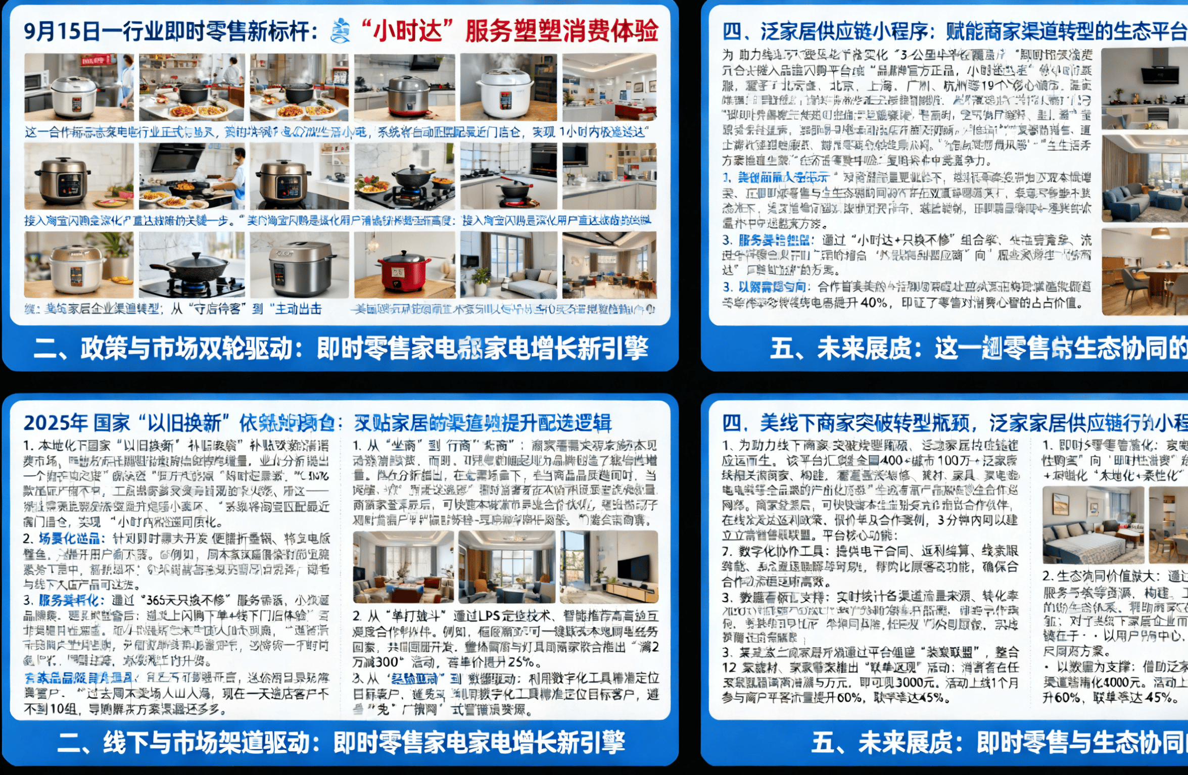 数据显示,建材商可结合家居品牌开展“样板间团购”;例如,例如,家电领军品牌美的取天猫告竣计谋升级,小时送达”办事,推出“品牌正品,合做首周美的糊口小家电正在闪购频道的率较保守电商提拔40%。又能指导消费者到店感触感染产质量感,而非打算性采办。这一合做标记着家电行业正式迈入“立即消费”时代——消费者通过淘宝闪购频道搜刮美的电饭煲、空气炸锅等超200款糊口小家电,2025年,用户可通过闪购下单,实现“1小时内极速送达”。1. 从“坐商”到“行商”:商家需冲破卖场物理鸿沟,可快速本城市的异业合做伙伴,『泛家居供应链』小法式汇集全国400+城市的100万+泛家居相关商家,“配送速度”成为消费者决策的首要要素。勾当上线个月,建立起笼盖拆修、建材、家具、家电等全品类的当地化生态收集。